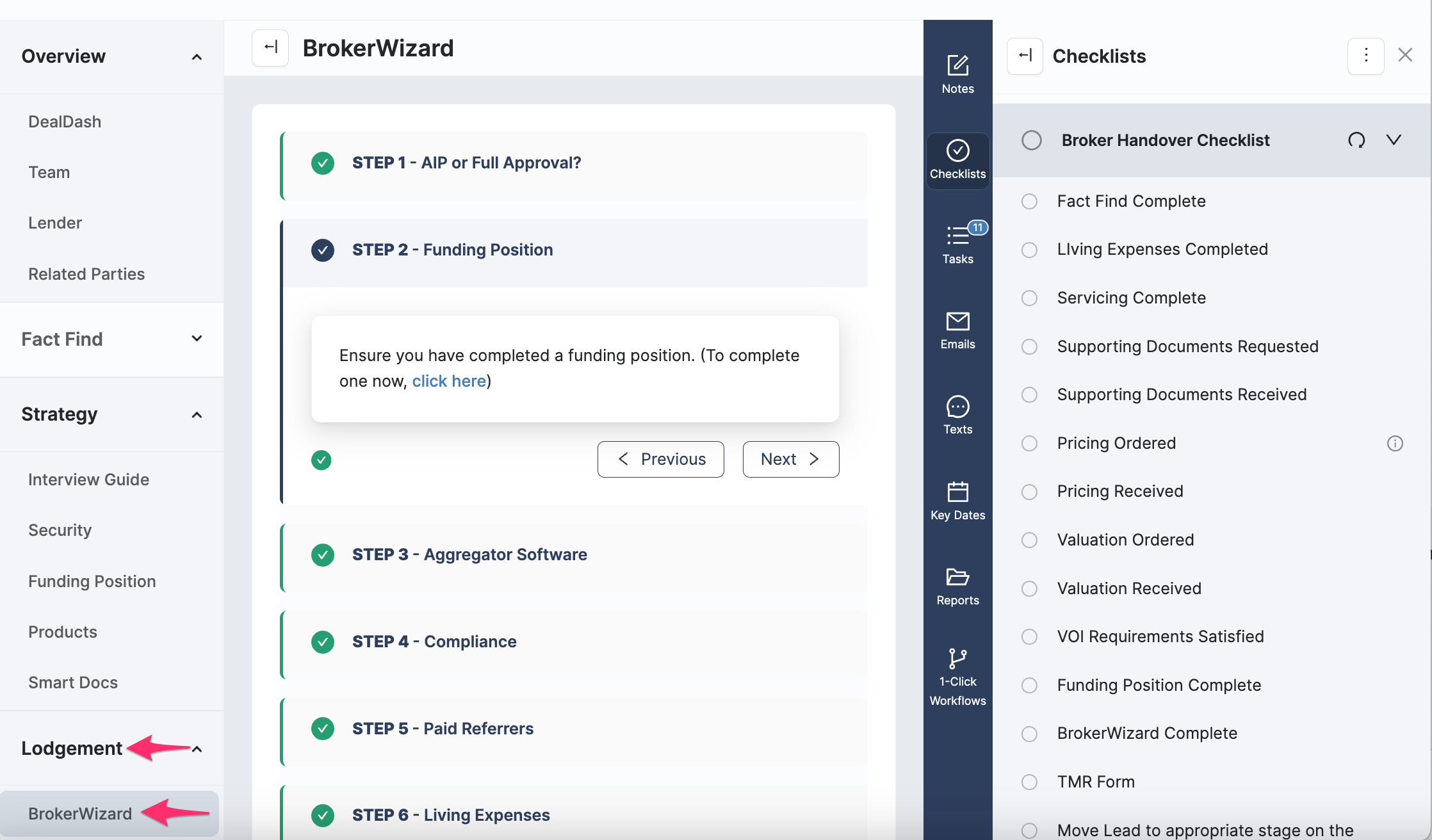 Go through the list and tick each completed item. Many brokers prefer to complete the Broker Wizard step last. The wizard takes the broker through a review and ensures all the key information the team needs to proceed with preparing the application for submission. \