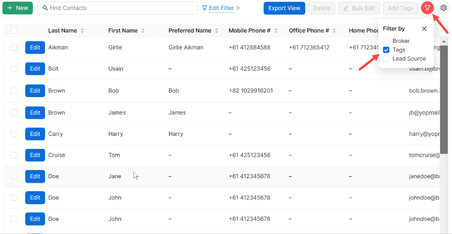 BrokerEngine displays all the contact records with the tag. Optionally, you can edit the number of table columns. Click the gear icon in the top right corner and select Edit Columns.