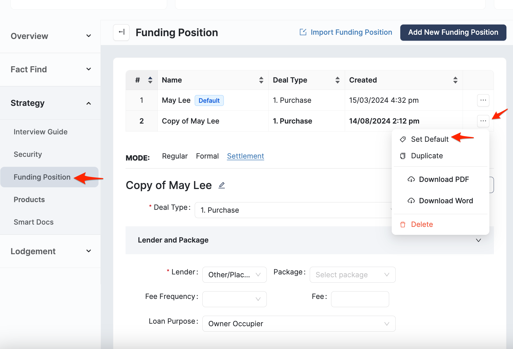 When the client finally selects a property and loan package, set the relevant funding position as the default.